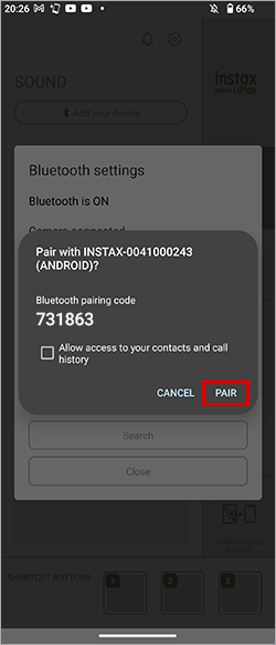 - 스마트폰 B에서: OS의 Bluetooth 설정에서 LiPlay 기기 이름(INSTAX-********) 옆에 표시되는 [Connect]을 누릅니다.