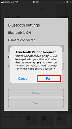 - 접속 가능한 카메라가 앱의 블루투스 설정 화면에 표시되면 접속 버튼을 누릅니다.
